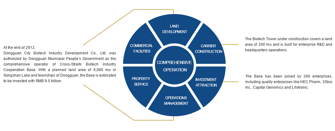 The comprehensive operation of an industry park involves land development, carrier construction, investment attraction, operations management, property service and commercial facilities. At the end of 2012, Dongguan City Biotech Industry Development Co., Ltd. was authorized by Dongguan Municipal People’s Government as the comprehensive operator of Cross-Straits Biotech Industry Cooperation Base. With a planned land area of 8,000 mu in Songshan Lake and townships of Dongguan, the Base is estimated to be invested with RMB 9.5 billion. As of the first half of 2017, the Base had been joined by 260 enterprises, including quality enterprises like HEC Pharm, 3Sbio Inc., Capital Genomics and Lifotronic. The Biotech Tower under construction covers a land area of 200 mu and is built for enterprise R&D and headquarters operations.