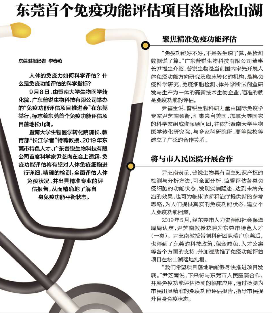 9月8日,由暨南大學生物醫(yī)學轉化院、廣東普銳生物科技有限公司舉辦的“免疫功能評估項目推進會”在東莞舉行,標志著東莞首個免疫功能評估項目落地松山湖。