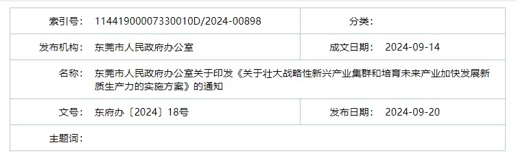東莞市人民政府辦公室關(guān)於印發(fā)《關(guān)於壯大戰(zhàn)略性新興產(chǎn)業(yè)集群和培育未來產(chǎn)業(yè)加快發(fā)展新質(zhì)生產(chǎn)力的實(shí)施方案》的通知
